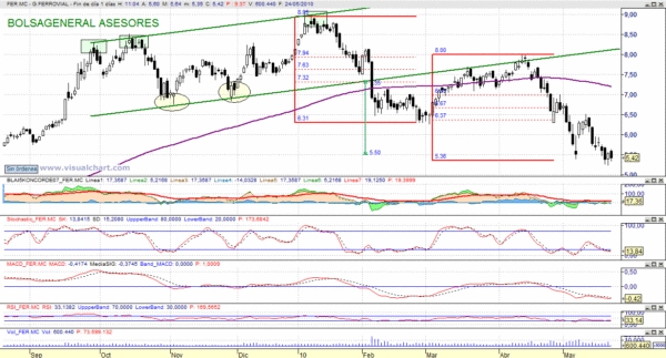 En mi último Análisis de Ferrovial del 15 de febrero con el valor en los 6,78 euros. comentaba que tenía activada una proyección bajista por ruptura de canal alcista hacia niveles de 5,50 euros.